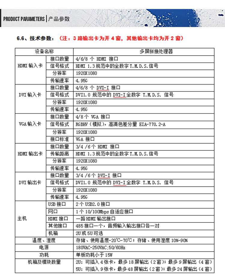 視頻輸入 (選配) | HDMI輸入板 (HD-IC04、HD-IC02) | 支持4/2通道HDMI信號(hào)輸入,HDMI Tpye A接口,支持HDCP,最大支持分辨率1920*1080@60Hz; |
